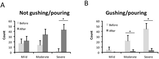 Type of bleeding before and after the treatment in mild, moderate, and severe HHT-ESS patients. (A). Not gushing /pouring. (B). Gushing /pouring. * p < 0.05.