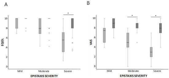 Box-whiskers plots corresponding to QOL parameters, EQ-5D (A) and VAS (B). Results are shown before and after the treatment in mild, moderate, and severe HHT-ESS patients. * p < 0.05.