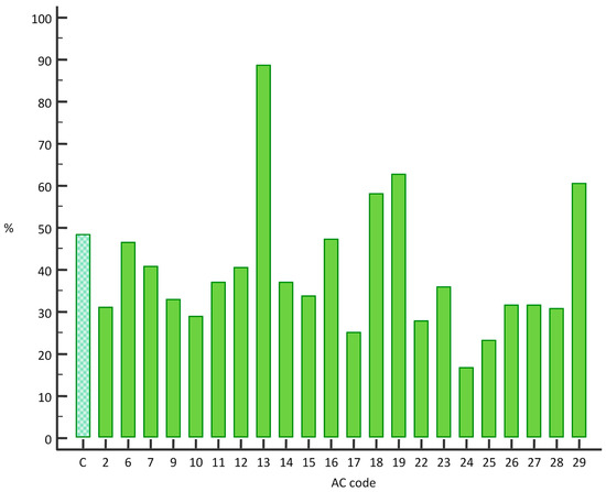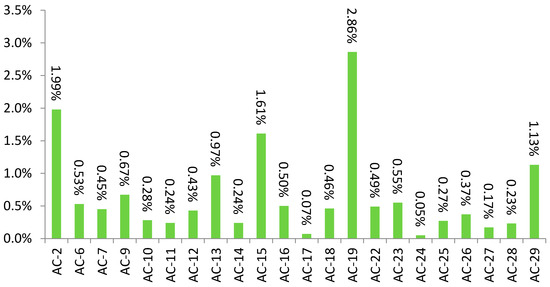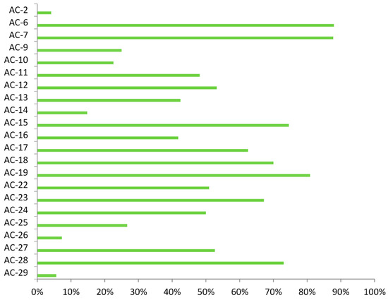 In 803 samples with rare IIF patterns we detected the presence of one or more specific autoantibodies (46.06%), a percentage that is quite similar to proportions found in the comparison group (48.40%). Specific autoantibodies were detected less frequently in samples with AC-2 (68/211 cases, p = 0.0003), AC-9 (24/73 cases, p = 0.0215), AC-15 (60/177 cases, p = 0.0041), AC-22 (15/54, p = 0.089), and AC-25 (7/30, p = 0.0108) patterns, while in samples with AC-13 (93/105 cases, p < 0.0001), AC-19 (197/314, p = 0.0013) and AC-29 (86/142, p = 0.0307) patterns, those autoantibodies were detected more frequently (Figure 2).
