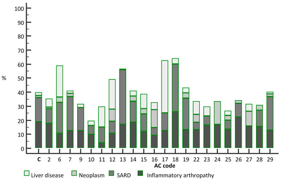 Liver diseases were the main referring diagnosis for 5/219 patients in the comparison group (2.28%). They were much more common in patients with the AC-6 pattern (13/58, 22.41%, p < 0.0001), as well as in patients with the AC-11 (4/27, 14.81%, p = 0.010) pattern, AC-12 pattern (10/47, 21.27%, p < 0.0001), AC-15 pattern (18/177, 10.17%, p = 0.001), AC-16 (3/8, 37.5%, p = 0.002) and AC-22 pattern (5/54, 9.26%, p = 0.028).