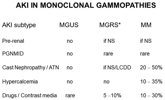 Major types of acute kidney injury complicating monoclonal gammopathies (MG), including forms of unknown significance (MGUS), forms with renal significance (MGRS), and hematologic malignancies such as multiple myeloma (MM). Prevalence data vary among different case series in the literature (range is given). Abbreviations: NS, nephrotic syndrome; PGNMID, proliferative glomerulonephritis with monoclonal Ig deposits; ATN, acute tubular necrosis; LCDD, light chain deposition disease. Drugs/agents potentially causing AKI include nonsteroidal anti-inflammatory drugs, radiological contrast media in the presence of significant blood levels of MC protein, or chemotherapy agents for MM as listed in Table 3. * In MGRS, NS may occur as a consequence of amyloidosis (without a bone marrow evidence of MM); similarly, LCDD with high levels of circulating MC protein may cause “cast” nephropathy.