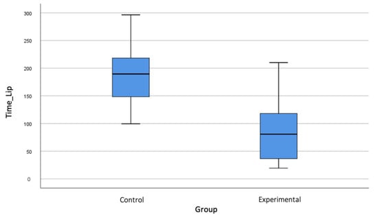 Bloxplot showing differences between control and experimental groups in lip numbness recovery time.