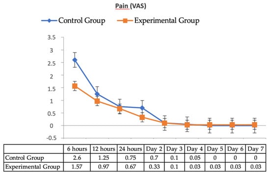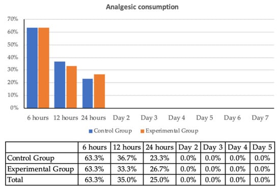 Postoperative pain intensity recorded by VAS (Figure 3) showed that in both groups, the pain response was similar and of moderate intensity, with values between 0 and 5. A similar trend was observed with the use of analgesics during the first 24 h and the absence of pain in the control group (Figure 4).