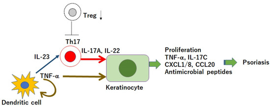Psoriasis is a chronic inflammatory skin disease characterized by accelerated tumor necrosis factor-α (TNF-α)/interleukin-23 (IL-23)/IL-17 axis and hyperproliferation and aberrant differentiation of epidermal keratinocytes (Figure 1) [1,2,3]. Dendritic cells (DCs) activated by various stimuli secrete TNF-α, which acts on themselves and induces their IL-23 secretion. IL-23 induces type 17 helper T (Th17) cells to proliferate and overproduce IL-17A and IL-22, which act on keratinocytes to promote their proliferation and production of the cytokines TNF-α and IL-17C; antimicrobial peptides or chemokines CXCL1/8 and CCL20 that recruit neutrophils, lymphocytes, and monocytes. Innate immune cells, such as type 3 innate lymphoid cells, γδT cells, or invariant natural killer T cells, also produce IL-17A, and are involved in the pathogenesis of psoriasis.