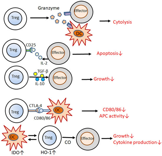 The suppressive function of Tregs is mediated by multiple mechanisms (Figure 2) [12]; Tregs kill effector T cells or DCs through granzymes [13]; Tregs compete for IL-2 with effector T cells via CD25 and deprive IL-2, thus, inducing apoptosis [14,15]; Tregs release IL-10 and TGF-β, suppressing the proliferation of effector T cells [16,17], and the interaction of CTLA4 with CD80/86 downregulates CD80/86 on DCs and decreases their potency of antigen-presenting cells (APCs) to activate T cells [18]; interactions with Tregs induce the activity of indoleamine 2,3-dioxygenase in DCs, which in turn upregulates heme oxygenase-1 activity in Tregs, and secretion of its product carbon monoxide inhibits the proliferation of effector T cells [19].