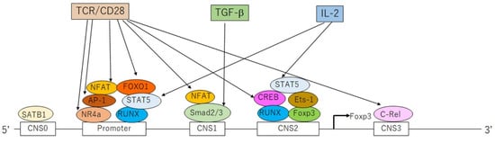 The binding of Foxp3 to target genes induces the expression of CD25, CTLA4, GITR, or HELIOS while repressing the expression of IL-2, IFN-γ, or RORγt in Tregs. Foxp3 expression is mediated by five enhancer elements [4]: 5′-first conserved non-coding sequence (CNS) 0, promoter region, and three further CNS (CNS1–3); these elements are bound by specific transcription factors (Figure 3) [4]. CNS2 is called the Treg-specific demethylation region (TSDR), whose demethylated status confers the stability of Foxp3 expression [6]. In tTregs, CNS2 is fully demethylated and bound by full sets of transcription factors [6]. In pTregs, CNS2 is demethylated with lower stability, whereas in iTregs, this locus is rarely demethylated, making this subset very unstable [6]. Foxp3 expression is initiated by the binding of self-antigens to TCR in combination with CD28 together with IL-2 and TGF-β [4]. The TCR/CD28 signal activates the binding of nuclear factor of activated T cells (NFAT), activator protein-1, forkhead box-containing protein O subfamily 1 (FOXO1), and nuclear receptor 4a to the promoter, NFAT binding to CNS1, cyclic AMP response element-binding protein binding to CNS2, and c-Rel binding to CNS3 [4]. TGF-β induces Smad2/3 binding to CNS1, whereas IL-2 induces signal transducer and activator of transcription (STAT) 5 binding to the promoter and CNS2 [4].
