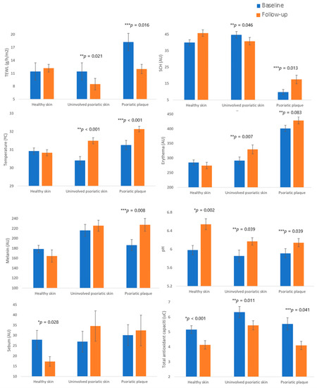 - Epidermal barrier function variables. Homeostasis parameters related to epidermal barrier function and skin homeostasis were measured. SCH (in arbitrary units, using Corneometer®CM825), TEWL (in g·m−2·h−1, using Tewameter®TM300), pH (using Skin-pH-Meter®PH905), erythema index (in arbitrary units, using Mexameter®MX18), sebum (in arbitrary units, usingSebumeter®SM815), and skin temperature (in °C, using Skin-ThermometerST500) were measured by a Multi Probe Adapter (MPA, Courage + Khazaka electronic GmbH, Köln, Germany). Total antioxidant capacity (TAC) was measured using eBQC® electrochemical method (Bioquochem S.L. (BQCkit), Asturias, Spain), and expressed in microcoulombs. TAC is divided into two sections: fast antioxidants (Q1), which have a lower oxidation potential, and slow antioxidants (Q2) [26]. All variables were measured at a psoriatic plaque on the elbow and at an uninvolved skin area near the elbow in psoriatic patients, while healthy subjects were measured at a skin area on their elbows. All parameters were measured ten times for each area, using their average for analysis. The measurements were taken in the same room. The average ambient air temperature at the time of the study was 22 ± 1°C, and the average ambient air humidity was 45% ± 3%.