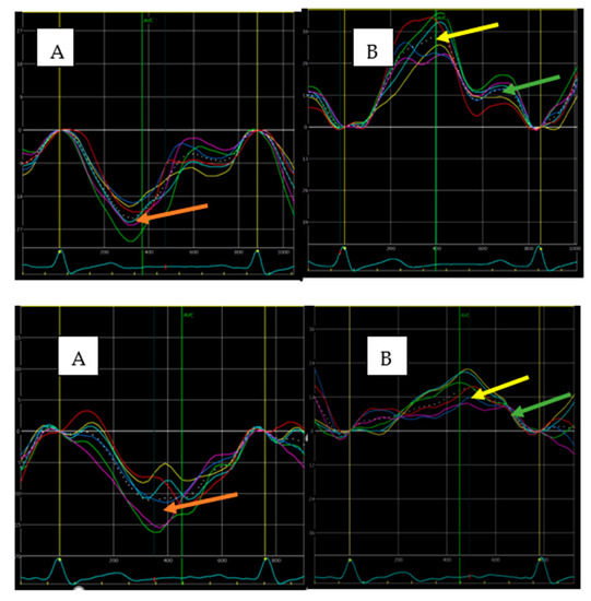 Examples of strain curves illustrating LV (A) and LA (B) function in HD (upper panel) and preemptive KTx patients (lower panel) obtained from the apical four-chamber view. Higher values of LV strain (24.8% vs. 11.3%; red arrows), PALS (36.7% vs. 15.1%; yellow arrows), and PACS (16.7% vs. 10.2%; green arrows) were found in patient from the preemptive KTx group.