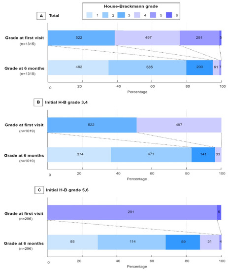 - House, W.E. Facial nerve grading system. Otolaryngol. Head Neck Surg. 1985, 93, 184–193. [Google Scholar] [CrossRef] [PubMed]