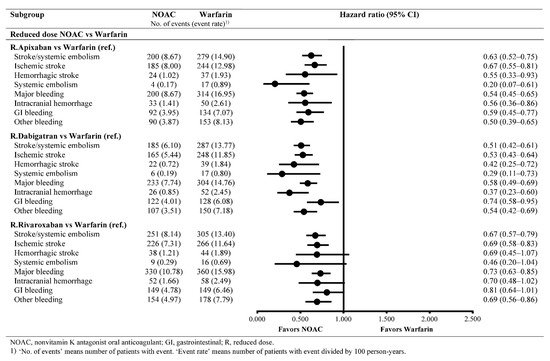 For analysis, the following three comparisons were performed: (1) reduced-dose apixaban versus warfarin, (2) reduced-dose dabigatran versus warfarin, and (3) reduced-dose rivaroxaban versus warfarin. All statistical analyses were performed using SAS 9.4 (SAS Institute Inc., Cary, NC, USA).