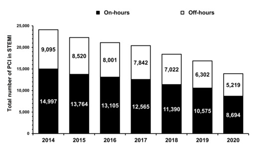 A significant decline in the total number of hospitalizations for PCI in STEMI was observed in 2020 as compared to the previous year for both timeframes (Figure 2).