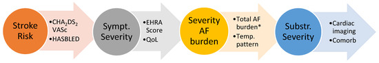 - Severity of AF burden: Assessing the AF burden includes not only the traditionally used classification of the temporal pattern into paroxysmal, persistent and permanent AF but also the total AF burden defined as the percentage of time in AF for a defined time frame. Higher AF burden have been associated with higher stroke risk [19] and mortality rates (if >6–24 h of AF per week) [20], poorer response to rhythm control therapy [21] and may represent progression of advanced atrial remodeling [22]. However, it remains unclear whether progressive AF burden is primarily a marker or a driver or both of progression of the underlying disease and adverse prognosis.