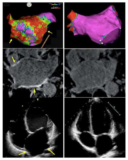 - Marrouche, N.; Wilber, D.; Hindricks, G.; Jais, P.; Akoum, N.; Marchlinski, F.; Kholmovski, E.; Burgon, N.; Hu, N.; Mont, L.; et al. Association of atrial tissue fibrosis identified by delayed enhancement MRI and atrial fibril-lation catheter ablation: The DECAAF study. JAMA 2014, 311, 498–506. [Google Scholar] [CrossRef]