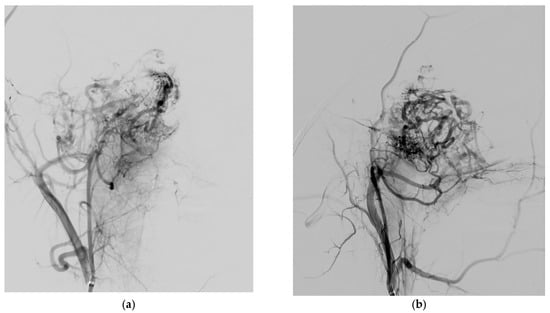 - Ballah, D.; Rabinowitz, D.; Vossough, A.; Rickert, S.; Dunham, B.; Kazahaya, K.; Cahill, A.M. Preoperative angiography and external carotid artery embolization of juvenile nasopharyngeal angiofibromas in a tertiary referral paediatric centre. Clin. Radiol. 2013, 68, 1097–1106. [Google Scholar] [CrossRef] [PubMed]