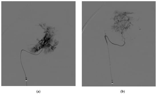 The same approach was performed for every patient, with right groin puncture and placement of 6F femoral sheath, catheterization of internal/external carotid artery (ICA/ECA) and vertebral artery (VA) with angiographic study of their vascular regions (Figure 2), followed by 6F guide catheter (Envoy MPC 90 cm, Cordis) in proximal ECA and superselective catheterization of lesion feeders. Microcatheters used (Rebar 18, Medtronic; SL-10, Stryker) ranged from 0.0165 in to 0.021 in of internal diameters; guidewires used (Traxcess 14, Synchro 10, Synchro 14, Stryker) ranged from 0.010 in to 0.014 in. A control run was then performed from the microcatheter to look for dangerous collaterals and determine the precise position of the distal tip (Figure 3). Embolization was then performed using PVA particles (Contour, Boston Scientific, Marlborough, MA, USA) with different sizes—ranging from 250–355 µm to 500–710 µm—in a slow infusion using blank roadmap visualization to achieve as proper distal penetration as anatomically possible until complete stasis of flow within each feeding vessel was achieved. Adjunctive coil embolization with GDC platinum coil was performed if particle embolization turned out to be incomplete, especially in the case of hypertrophied IMA. At the end of the procedure, control angiography was performed from both ICA and ECA to assess the percentage of tumor feeders embolized. Successful embolization was determined as a lack of contrast in the vascular territory of the embolized vessel (Figure 4).