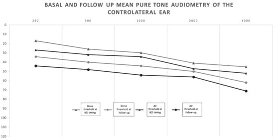 Mean basal air and bone conduction thresholds of the contralateral ear at BCI timing and at follow-up: transition from SSD to AHL.