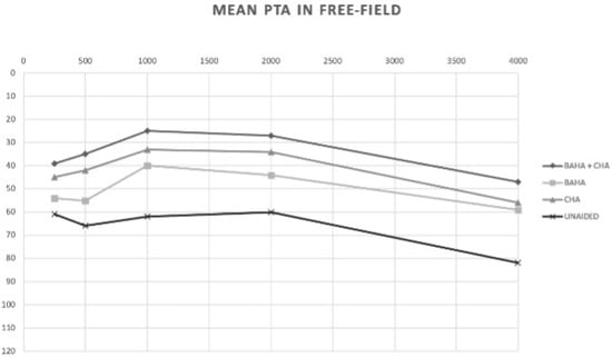 Comparison of free-field PTA in the unaided, BAHA, CHA and BAHA + CHA conditions.