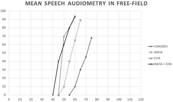 The comparison of the four different conditions (unaided, contralateral CHA, BAHA and BAHA with CHA), provided some interesting results that are worth discussing. The “unaided” PTA and speech audiometry in quiet achieved similar results in the ear contralateral to the implant, whilst the comparison between the “unaided” condition and the other differently aided solutions resulted in significantly better scores for the latter.