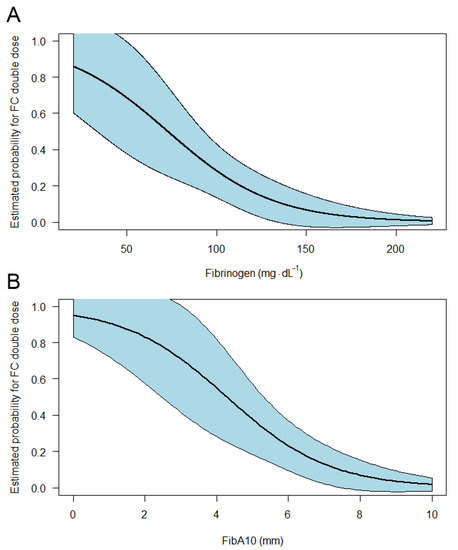 Estimated probability for the need of double dose fibrinogen concentrate administration in dependency of initial fibrinogen levels (A) and fibrin polymerization (FibA10, B).
