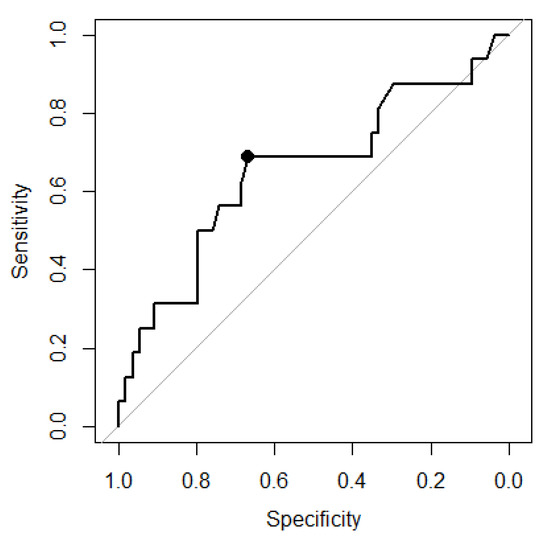 Here, a threshold of 204.5 mg·dL−1 as assessed by Youden index maximization predicted MT with a specificity of 0.6666 and a sensitivity of 0.6875 (Figure 3). In general, 16 of 70 study patients (22.9%) were in need of MT; 11 of the 29 patients (37.9%) with post-treatment fibrinogen concentrations below and five of the 41 patients (12.2%) with post-treatment fibrinogen concentrations above the above-mentioned threshold (OR 4.35 (1.1627 to 20), p = 0.0194). Patients in need of MT were generally more severely injured and presented with lower hemoglobin and coagulation measurements at admission (data not shown). After the first treatment loop, patients with MT had similar Hb values (median 8.85 vs. 9.05 g·dL−1) but significantly lower platelet counts (median 61 vs. 124 g·L−1) when compared to patients without MT.