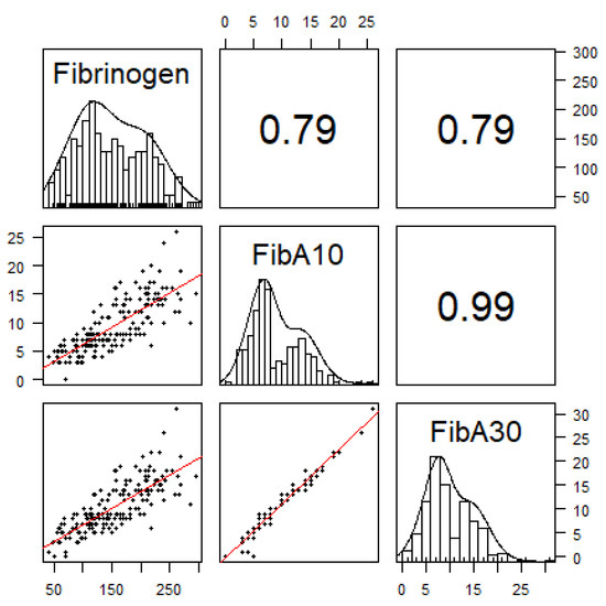Pearson’s correlation: The panels show the distribution of fibrinogen measurements [Clauss’ method (mg·dL−1)] and its correlation to fibrin polymerization (mm) at 10 min (FibA10) and 30 min (FibA30) using all in parallel performed measurements (n = 193). Correlation coefficients were 0.79 between fibrinogen concentrations and FibA10 as well as FibA30 and 0.99 between FibA10 and FibA30.