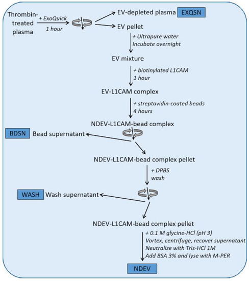 Experimental workflow for exosome validation studies. Thrombin-treated plasma was first processed with ExoQuick polymer reagent, whereafter the EV-depleted plasma (EXQSN) was collected. The EV pellets were then mixed with L1CAM biotinylated antibody, then streptavidin-coated beads. The bead supernatant (BDSN) was collected for biomarker analyses and the bead complex was next washed with Dulbecco’s Phosphate Buffered Saline (DPBS) (WASH was collected). Neuron-derived small extracellular vesicles (NDEVs) were then recovered from the mix. Exosome-related proteins and neuron-specific proteins were measured at each step of the isolation procedure. The results from these validation studies are presented in Figures 2 and 3.