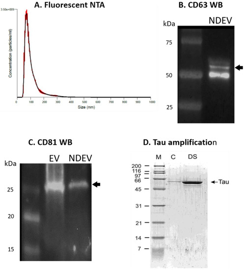 NDEV characterization. (A) Fluorescent nanoparticle tracking analysis illustrating size distribution and concentration of extracellular vesicles in neuron-derived exosome samples. The single peak at ≈100 nm suggests small extracellular vesicle (EV)-specific enrichment. (B) Representative Western blot image of CD63 tetraspanin protein indicative of EV enrichment. CD63 (System Biosciences, EXOAB-CD63A-1) was detected at 53 kD in NDEVs isolated from human plasma via Western blot. (C) Representative Western blot showing tetraspanin CD81 (SAB3500454, Sigma Aldrich) at 25 kD in total EVs (EV) from human plasma (System Biosciences, EXOP-500A-1) and neuron-derived EVs (NDEV) isolated from human plasma. (D) Amplification of Tau fibrils from NDEVs obtained from blood. M = marker, C = control NDEVs, DS = NDEVs from plasma from a subject with Down syndrome.