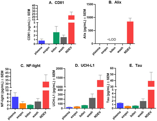 To further demonstrate NDEV enrichment in our samples, we used four plasma samples from healthy volunteers and isolated NDEV as described above and, in addition to the final NDEV, collected supernatant after each step (EXQSN, WASH and BDSN) of the isolation protocol as depicted in Figure 1. EV-specific markers were measured using commercial ELISA kits: levels of membrane-bound CD81 and luminal Alix were assessed using ELISA kits (Cusabio, Houston, TX, USA). To demonstrate enrichment for neuron-specific proteins, we measured using single molecule array (Simoa) technology on the SR-X instrument (Quanterix, MA, USA) the levels of Tau, UCH-L1 and NF-light in plasma, the three different supernatants collected at each isolation step and the final NDEV preps (see experimental outline in Figure 1).
