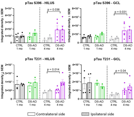 Densitometry of p-Tau S396, and p-Tau T231 in the Hilar region (left panels) and the GCL (right panels) of the hippocampus. There was a significant increase in p-Tau S396 staining in the Hilar region between DS-AD and controls at 4 months (p = 0.03) and in the GCL (p = 0.03). In addition, there was a significant increase in T231 p-Tau after 4 months in mice injected with DS-AD vs. Controls in the hilar region (p = 0.014) and in the GCL (p = 0.04).