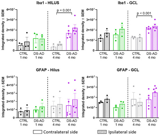 To determine whether the NDEVs from controls or DS-AD gave rise to long-lasting neuroinflammation in the recipient injected brain region, we examined staining density for GFAP and Iba1 (Figure 7) 1 or 4 months following the intrahippocampal injection. Iba1 immunohistochemistry showed significant microglia activation in mice injected with DS-AD NDEVs, compared to those injected with NDEVs from control blood (Figure 7). This was observed to a much greater extent 4 months after injection, compared to 1 month post-injection (Figure 7). A similar increase staining of astrocytes could also be observed using the astrocyte marker GFAP (Figure 7), although this reaction to the NDEV injections was variable between animals and was not as robust as the microglial activation observed with Iba1. However, densitometry measurements were conducted on the Iba1 and GFAP staining density in the Hilar region as well as in the GCL (Figure 8). A significant increase in the Iba1 staining intensity could be observed in both these sub-regions of the hippocampus between control- and DS-AD-injected mice (p ≤ 0.001) 4 months after the injection (Figure 8), but not after 1 month. However, the densitometry of GFAP labeling revealed a more variable effect of the NDEV injections, with increased gliosis observed also in some control-NDEV injected mice (Figure 8, lower part).