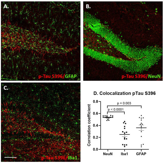 To determine which cell types contained p-Tau-immunoreactive cells following the NDEV injections, immunofluorescent double labeling was conducted with NeuN (neuronal marker), GFAP (astrocyte marker) and Iba1 (microglial marker), see Figure 9, Figure 10, Figures S1 and S2. When the markers were analyzed for co-localization, there were differences in the p-Tau presence in glial cells between the two epitopes. For the p-Tau S396 antibody, most staining was localized in NeuN-immunopositive neurons, compared with GFAP (p = 0.003) and Iba1 (p < 0.001) staining, although some astrocytes and microglial cells containing the S396 epitope antibody could also be observed (Figure 9). Most p-Tau/NeuN double-labeled neurons were observed in the granule cell layer, with some scattered neurons seen in the hilar region of the dentate gyrus (Figure 9). Pixel intensity correlation confirmed these findings (Figure 9D). However, it could be seen that some astrocytes also contained staining for this p-Tau epitope. Previous studies have shown that p-Tau inclusions can appear in astrocytes in aggressive AD pathology and contribute to neuroinflammation and to the spread of pathology [89].