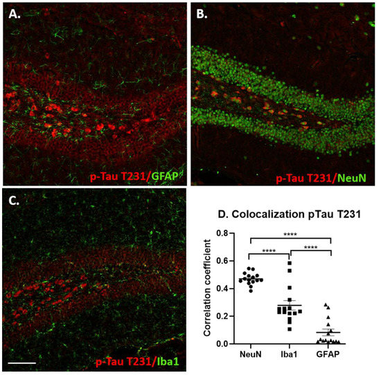 As mentioned above, the distribution of p-Tau T231 immunoreactivity was significantly different from that of the staining for the S396 p-Tau epitope. P-Tau T231-positive cells were mostly observed in the hilar region of the dentate gyrus and in CA4/CA3 (not shown). Figure 10 shows the double labeling of p-Tau T231 with GFAP (A), NeuN (B), Iba1 (C). This epitope was almost exclusively located within neurons and an intensity correlation for co-localization confirmed this observation, demonstrating a highly significant percentage of neurons co-labeled with NeuN compared to both Iba1 (p < 0.001) and GFAP (p < 0.001) immunostained cells (Figure 10D).