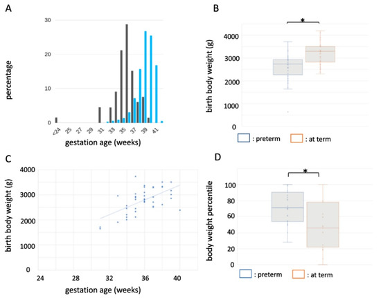 Preterm birth characteristics of MVID. (A) Distribution of gestational ages in MVID (black bars) versus population (blue bars). (B) Box-and-whisker plot showing average and mean body weights in MVID patients born preterm (blue) and at term (orange). (C) Correlation between gestational age and body weight in MVID. (D) Box-and-whisker plot showing average and mean body weight percentiles in MVID patients born preterm (blue) and at term (orange). *: p < 0.05. For exact p values see text.