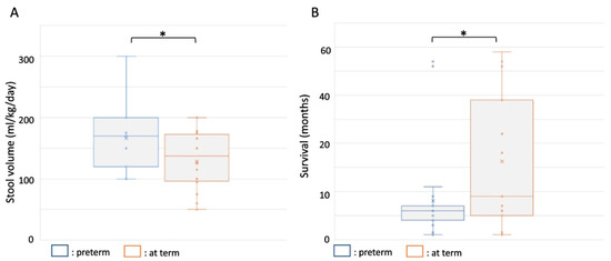 Stool volume and survival in MVID patients born preterm and at term. (A) Box-and-whisker plot showing average and mean stool volumes in MVID patients born preterm (blue) and at term (orange). (B) Box-and-whisker plot showing average and mean survival in MVID patients born preterm (blue) and at term (orange). *: p < 0.05 (for exact p values see text).