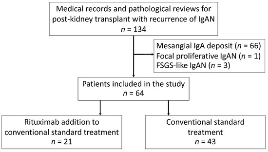 To assess the histopathological effects of rituximab, the most recent renal allograft biopsy conducted prior to rituximab treatment was compared with the subsequent biopsy by a pathologist in a blinded fashion. In addition to strongly positive IgA staining in part of the immunofluorescence (IF), the light microscopic (LM) characteristics, including mesangial expansion, endocapillary hypercellularity, glomerulosclerosis, and interstitial fibrosis (on silver- and trichrome-stained tissues), were semi-quantitatively scored using MEST-C classification [24] as follows: (i) mesangial hypercellularity (M) was scored from 0 to 1 (0 ≤ 50% of glomeruli showing mesangial hypercellularity, 1 ≥ 50% of glomeruli showing mesangial hypercellularity; (ii) endocapillary hypercellularity (E) was scored from 0 to 1 (0 = no endocapillary hypercellularity, 1 = any glomeruli showing endocapillary hypercellularity); (iii) segmental glomerulosclerosis (S) was scored from 0 to 1 (0 = absent, 1 = present at any glomeruli); (iv) tubular atrophy/interstitial fibrosis (T) was scored from 0 to 3 (0 = 0–25% of cortical area, 1 = 26–50% of cortical area, 2 ≥ 50% of cortical area); and (v) cellular or fibrocellular crescent (C) was scored from 0 to 2 (0 = absent, 1 = 0–25% of glomeruli, 2 ≥ 25% of glomeruli). Electron microscopy (EM) showed electron-dense deposits in the mesangial area without acute rejection in the renal pathology of any of the eligible recipients. Biopsy-proven acute rejection (BPAR) was diagnosed either a “for cause” or a “surveillance” biopsy. BPAR was defined as (i) T-cell-mediated rejection (TMCR) if the histology met the Banff 1997 definition of borderline rejection or higher (i.e., Banff lesion score i ≥ 1 and t ≥ 1) or (ii) antibody-mediated rejection (ABMR) if it met the Banff 2013 criteria for ABMR, including C4d-negative ABMR [25,26].