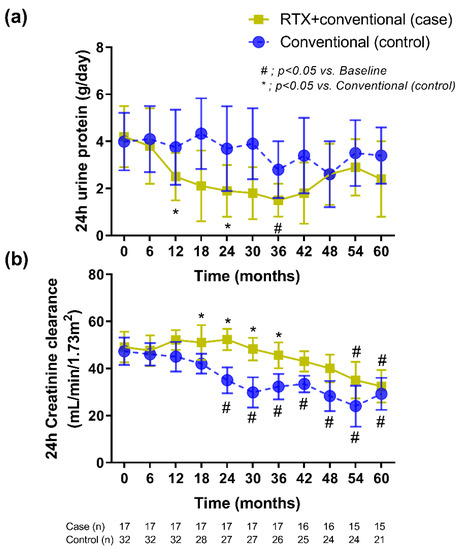 The treatment responses in the kidney transplant recipients with rituximab administration plus the conventional standard treatment versus those with the conventional standard treatment alone as demonstrated by (a) 24 h proteinuria and (b) 24 h creatinine clearance. The data included only recipients who had a follow-up duration ≥36 months with censoring in whom there was nonfunctioning graft (or required long-term renal replacement therapy). RTX, rituximab.