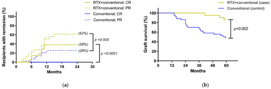 Treatment outcomes: (a) the percentages of recipients in each of the 4 subgroups according to the treatment response indicated as complete remission (CR) or partial response (PR) (see Method); (b) Kaplan-Meier estimates of renal allograft survival in recipients correspond to treatment group; RTX, rituximab.