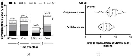 Post-treatment histopathology and immune cells: (a) histologic information on renal allograft biopsy at baseline and at 12 months is demonstrated following the MEST-C criteria in the updated Oxford classification of IgA nephropathy (M = mesangial hypercellularity, M0–M1; E = endocapillary hypercellularity, E0–E1; S = segmental glomerulosclerosis, S0–S1; T = tubular atrophy/interstitial fibrosis, T0–T2; and C = cellular or fibro-cellular crescents, C0–C2). (b) The duration of CD19 B-cell repopulation after rituximab administration compared between the patients with a complete response (CR) (n = 8) and those with a partial response (PR) (n = 10) (participants did not perform testing; n = 3). (Violin plots show the differences in the average (diamond), median (middle line) and time of repopulation). Conv, conventional standard treatment group; RTX, rituximab. # p < 0.05 versus baseline; and * p < 0.05 versus conventional.