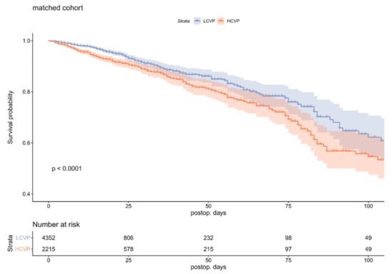 Descriptive statistics of the resulting matched groups are shown in Table 1. After matching, there were no significant differences in age, sex, type of intervention, priority of surgery, and APACHE II between the LCVP and HCVP group. Additionally, PSM resulted in the two groups having no significant differences in terms of these selected preexisting medical conditions: coronary heart disease, peripheral arterial disease, arterial hypertension, congestive heart failure, pulmonary artery hypertension, chronic obstructive pulmonary disease, diabetes, and chronic kidney disease.