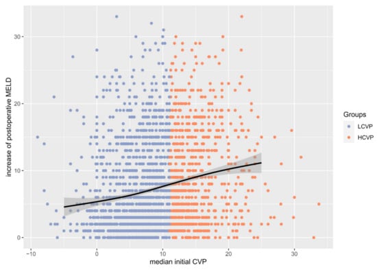 Rise of postoperative MELD score in relation to median initial CVP. MELD: Model of End-Stage Liver Disease Score.