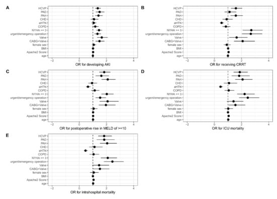 Logistic regression in the matched study population revealed statistically significant odds ratios (OR) for: HCVP and acute kidney injury (OR 1.361; 95% CI: 1.171–1.585; p < 0.001) (Figure 4a), HCVP and CRRT (patients with pre-existing CRI excluded) (OR 1.584; 95% CI: 1.221–2.048; p < 0.001) (Figure 4b), HCVP and postoperative increase of MELD score of more than 10 points (OR 1.834; 95% CI: 1.470–2.289; p < 0.001) (Figure 4c), HCVP and ICU mortality (OR 1.869; 95% CI: 1.419–2.458; p < 0.001) (Figure 4d), and HCVP and in-hospital mortality (OR 1.828; 95% CI: 1.391–2.399; p < 0.001) (Figure 4e).