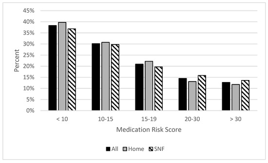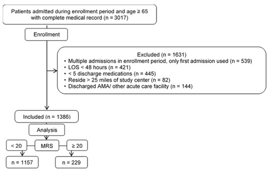 The primary objective of the study was to establish the level of medication-related risk based on MRS in an elderly acute care population. The primary outcome assessed was the proportion of patients with a high or severe MRS, defined as a score greater than or equal to 20 (referred to as the high-risk group herein). Patients were then stratified into either the high-risk or control group based on the MRS (MRS ≥ 20 and MRS < 20, respectively). The secondary outcome was 30-day hospital readmissions. Prespecified subgroup analyses in patients discharged to home and to other facilities after their index admission were performed.
