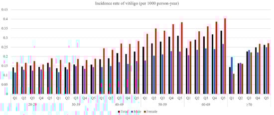 Of the total, 16,800 female subjects were diagnosed with vitiligo during the observation period (63,060,700 person-years). Vitiligo incidence of the Q5 group was 0.29 per 1000 person-years. The HR and 95% CI of the Q5 group were 1.35 (1.28–1.42) under multivariate analysis (model 2) (Table 2).