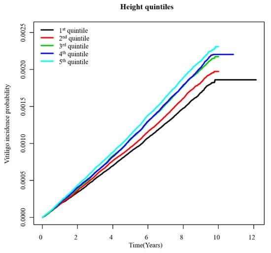 Adjusted cumulative incidence of vitiligo by height (Q1–Q5).