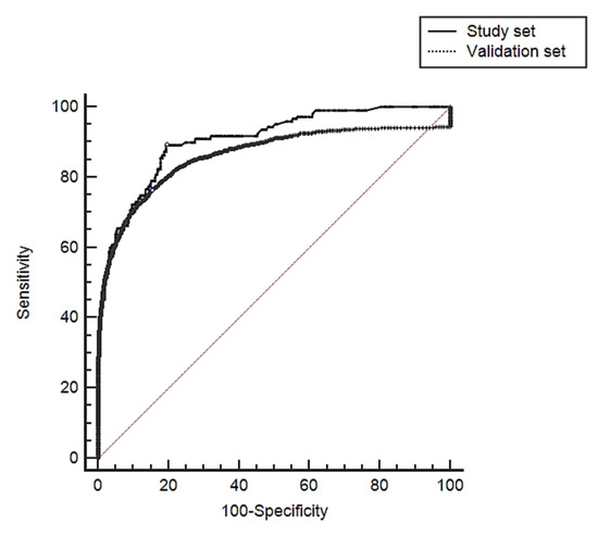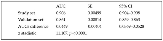 Comparison between AUCs obtained in the study set and in the validation set.