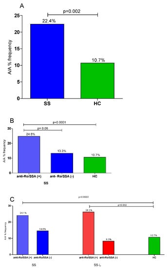 Given the identified difference in the frequency of anti-Ro/SSA between patients carrying the A/A genotype vs. those harboring the A/G and G/G genotypes, we next stratified SS patients according to anti-Ro/SSA and lymphoma status. As shown in Figure 1, the difference between the whole SS population vs. HC (22.4% vs. 10.7%, p = 0.002, panel A) is mainly attributed to differences detected between the anti-Ro/SSA positive [24.8% vs. 10.7%, p = 0.0001, OR 95% CI: 2.8 (1.7–4.4)], rather than the anti-Ro/SSA negative group compared to the HC group (13.3 vs. 10.7, p > 0.05, panel B). Of interest, both anti-Ro/SSA positive SS and SS-L patients displayed increased frequency of the A/A genotype compared to HCs (24.1% vs. 10.7%, p = 0.0002, and 26.2% vs. 10.7%, p = 0.002, respectively).