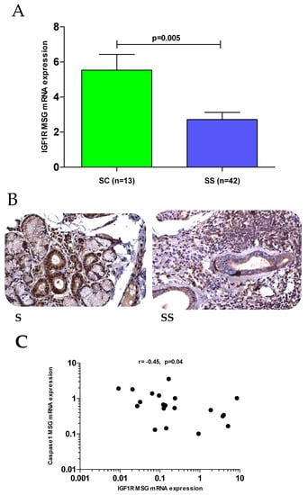 IGF1R mRNA (measured by real-time PCR) and immunohistochemical expression in SC vs. SS patients. (A) IGF1R transcript levels were significantly lower in MSG tissues derived from SS patients compared to SCs (2.7 ± 2.7 vs. 5.5 ± 3.2, p = 0.005). (B) Representative images depicting reduced IGF1R immunohistochemical expression in salivary ducts and acini of MSG tissue sections from a patient with SS compared to SCs (40×). (C) Negative correlation between IGF1R transcripts caspase 1 mRNA expression in MSGs derived from SS patients (r = −0.45, p = 0.04). SS: Sjogren’s syndrome; MSG: minor salivary gland; IGF1R: insulin growth factor receptor 1; r: Spearman’s correlation.