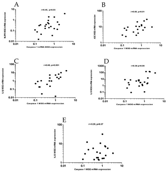 Given the well-established effects of the IGF1/IGF1R axis in cell growth and survival [37,38,39], we hypothesized that dampened IGF1R expression in SS MSG tissues could be related to apoptotic events in SS salivary gland epithelial cells, as previously described [14]. Towards this end, gene expression of several apoptotic molecules was determined, including caspases 1, 4, and 5, as well as NLRP3- inflammasome components (NLRP3, ASC, IL1β, IL18, IL33). Of interest, IGF1R mRNA expression was only found to be significantly inversely correlated with caspase 1 mRNA expression (r = −0.45, p = 0.04) in SS-derived MSGs (Figure 2C). In turn, as displayed in Figure 3, caspase 1 mRNA expression in MSG tissues was significantly associated with several components of the inflammasome axis, including NLRP3 (r = 0.45, p = 0.03, panel A), ASC (r = 0.58, p = 0.01, panel B), and IL1β (r = 0.68, p = 0.001, panel C). No significant associations were detected between caspase 1 with IL18 (r = 0.36, p = 0.08, panel D) or IL33 MSG tissue transcripts (r = 0.20, p = 0.37, panel E). As shown in Figure S2, and in accord with previous reports [18,19], inflammasome components were upregulated in SS patients compared to SCs (Figure S2).
