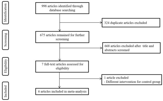 A diagrammatic representation of the search process is shown in Figure 1. A total of 998 studies were initially identified using the search criteria. After removing duplicates, 675 studies remained. Based on the results of the screening of titles and abstracts, 668 studies were discarded. The full texts of the seven remaining papers were retrieved and assessed in more detail for eligibility, and one study was excluded as the intervention protocol for the comparison group was inconsistent with the inclusion criteria. Finally, six studies [36,37,38,39,40,41] with a total of 429 participants, were included in the meta-analysis.