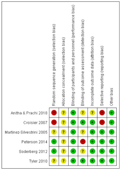 Two studies [36,37] were determined to have a high risk of random sequence generation because they used methods of convenient sampling or allocation according to the judgment of the clinician. Two studies [38,41] provided insufficient details regarding how randomization was performed and were determined to have an unclear risk of bias. In all six studies [36,37,38,39,40,41], the methods did not describe the allocation concealment, and all studies were determined to have an unclear risk. As these studies were experimental trials of performing eccentric exercises by the participants themselves, complete participant blinding seemed difficult. In this study, we only included studies with non-surgical interventions, such as strengthening, stretching, or physical modalities, in both the experimental and comparison groups. Thus, we regarded these studies as having a low risk of participant blinding. One study [39] with an unblinded assessor was considered to have a high risk of assessment blinding. A high risk of selective reporting was ascribed to two studies [36,37] that did not report the scales of pre-intervention. We only included studies from which the effects of eccentric exercise could be evaluated: (eccentric exercise + adjuvant therapy vs. same adjuvant therapy) or (eccentric exercise vs. other strengthening exercises). Thus, there was a low risk of other biases regarding interventions. Figure 2 provides a detailed evaluation of the methodological quality.